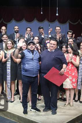 وأهدى جلال، مخرج "سينما مصر" شهادة تقدير للفنان محمد هنيدي، موقعة من كل أبطال العرض تحمل عنوان "إلى من عاش ليبقى"، عقب عرض المسرحية.