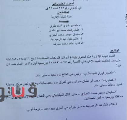 أصدرت المحكمة التأديبية العليا بمجلس الدولة حكمها في القضية رقم 225 لسنة 61 قضائية عليا بمجازاة اثنين من رؤساء الأحياء بمحافظة بورسعيد و3 مسئولين آخرين من مساعديهم بعد ثبوت ارتكابهم مخالفات مالية وإدارية جسيمة وإساءة إستخدام السيارات الحكومية.