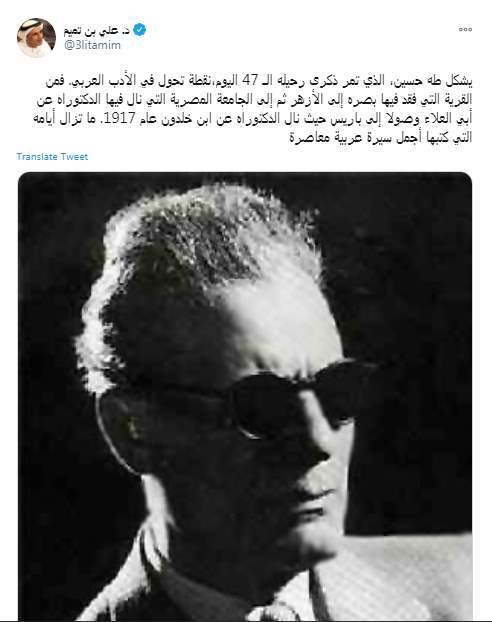 وكتب علي بن تميم تغريدة على "تويتر": "يشكل طه حسين، الذي تمر ذكرى رحيله الـ 47 اليوم، نقطة تحول في الأدب العربي.. فمن القرية التي فقد فيها بصره إلى الأزهر ثم إلى الجامعة المصرية التي نال فيها الدكتوراه عن أبي العلاء وصولا إلى باريس حيث نال الدكتوراه عن ابن خلدون عام 1917. ما تزال أيامه التي كتبها أجمل سيرة عربية معاصرة".