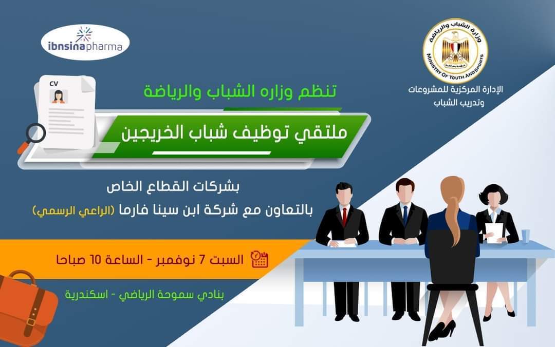 تنظم وزارة الشباب والرياضة، برئاسة الدكتور أشرف صبحى وزير الشباب والرياضة، أول ملتقى توظيف لشباب الخريجين في ظل جائحة كورونا بالتعاون مع مجموعة كبيرة من شركات القطاع الخاص لتوفير ما يقرب من 2000 فرصة عمل لحملة المؤهلات العليا والمتوسطة - من خلال الإدارة المركزية للمشروعات وتدريب الشباب (الإدارة العامة للمشروعات) برعاية شركة ابن سينا فارما- وذلك يوم السبت الموافق 7 نوفمبر المقبل بنادى سموحة الرياضى بالإسكندرية.