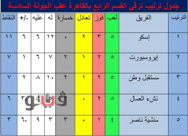 جدول ترتيب دورة ترقي القسم الرابع بالقاهرة بعد الجولة السادسة