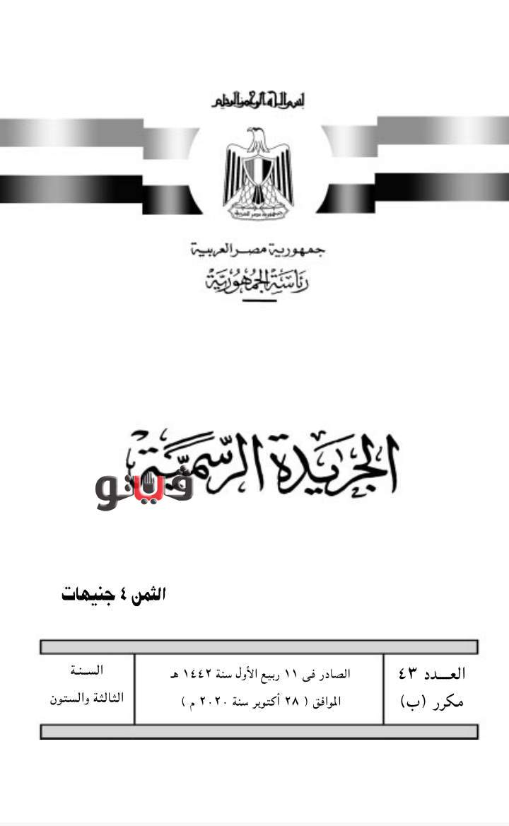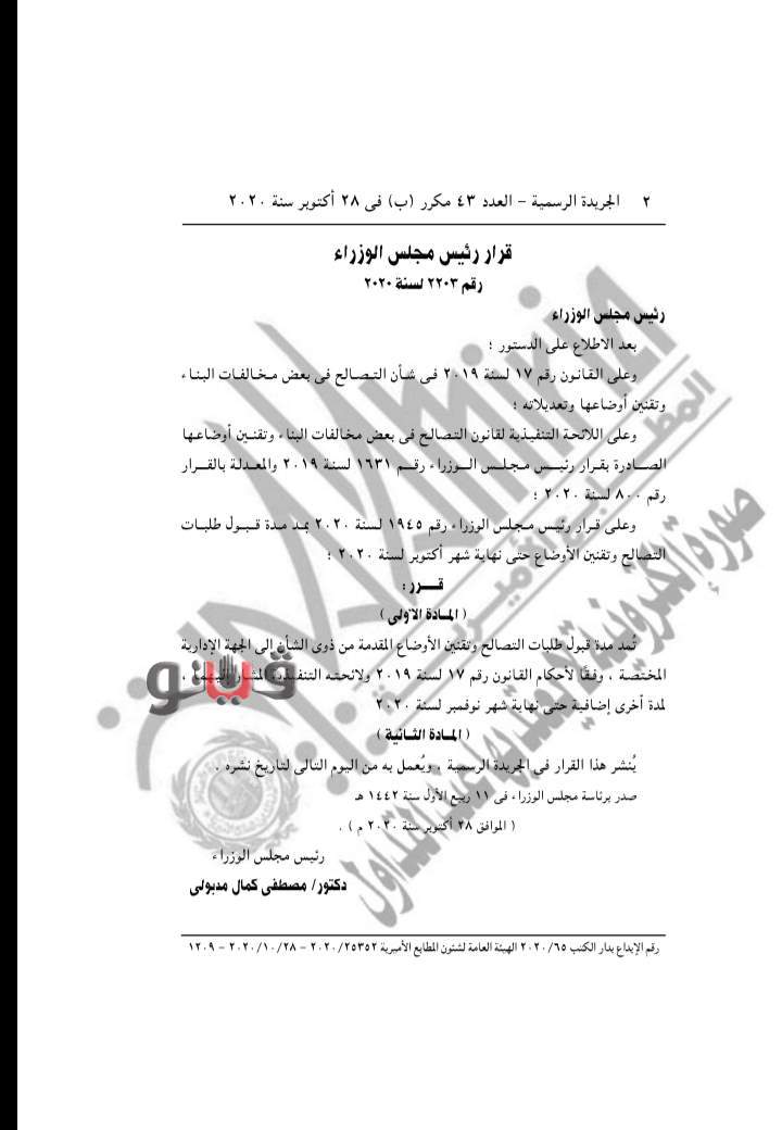 نشرت الجريدة الرسمية في عددها رقم 43 مكرر " ب" الصادر في يوم 28 أكتوبر لسنة 2020، قرار رئيس مجلس الوزراء رقم 2203 لسنة 2020، بشأن مد فترة قانون التصالح على مخالفات البناء.