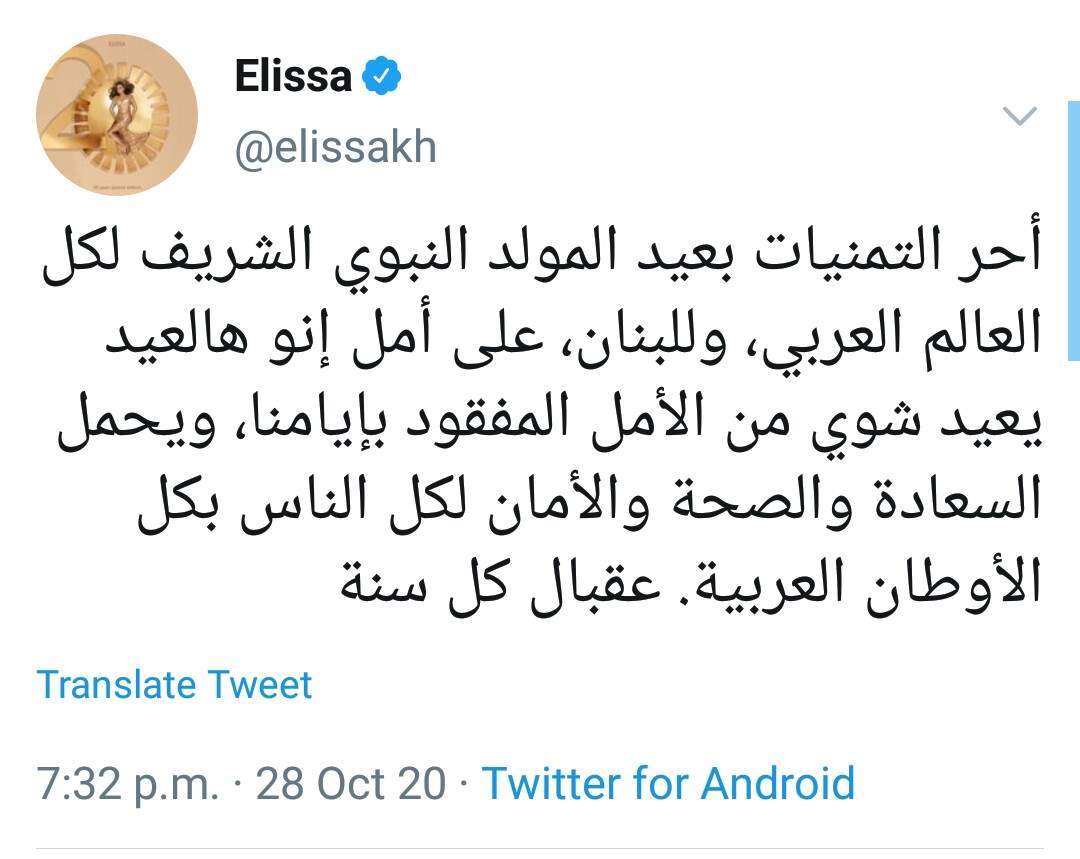 وكتبت إليسا قائلة: "أحر التمنيات بعيد المولد النبوي الشريف لكل العالم العربى، وللبنان، على أمل إنو هالعيد يعيد شوي من الأمل المفقود بأيامنا، ويحمل السعادة والصحة والأمان لكل الناس بكل الأوطان العربية. عقبال كل سنة".