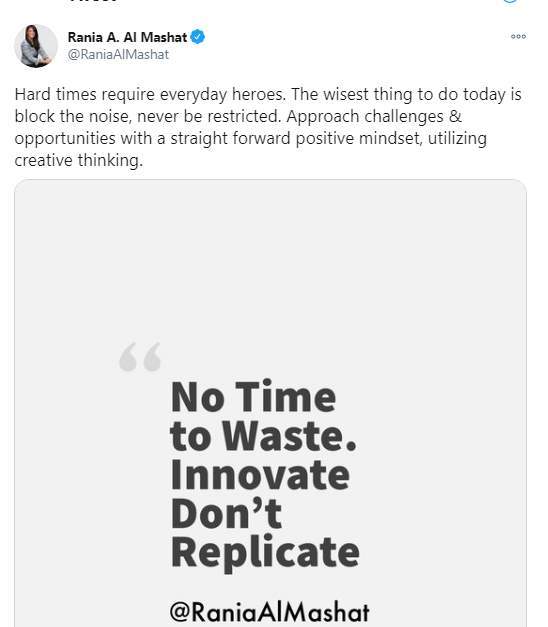 وكتبت رانيا المشاط تغريدة على تويتر "الأوقات الصعبة تتطلب أبطالاً كل يوم. والشيء الأكثر حكمة لما نفعله اليوم هو أن نمنع الضوضاء، وألا نكون مقيدين حيال ذلك أبدًا. وأن نتعامل مع التحديات والفرص بعقلية إيجابية مباشرة، باستخدام التفكير الإبداعي".