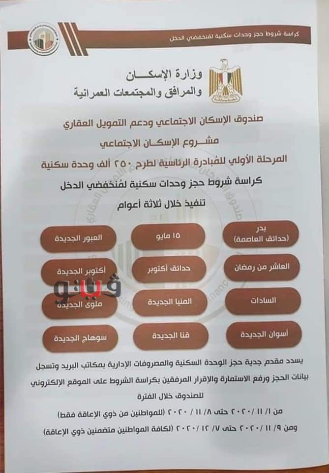 _ فتح باب الحجز، وشراء كراسات الشروط، وسداد مُقدمات جدية الحجز، من يوم الأحد الموافق 1/11/2020 : يوم الأحد 8/11/2020، لذوي الاحتياجات الخاصة فقط، ومن يوم الإثنين 9/11/2020 : يوم الإثنين 7/12/2020، لجميع المواطنين متضمنين ذوي الاحتياجات الخاصة.