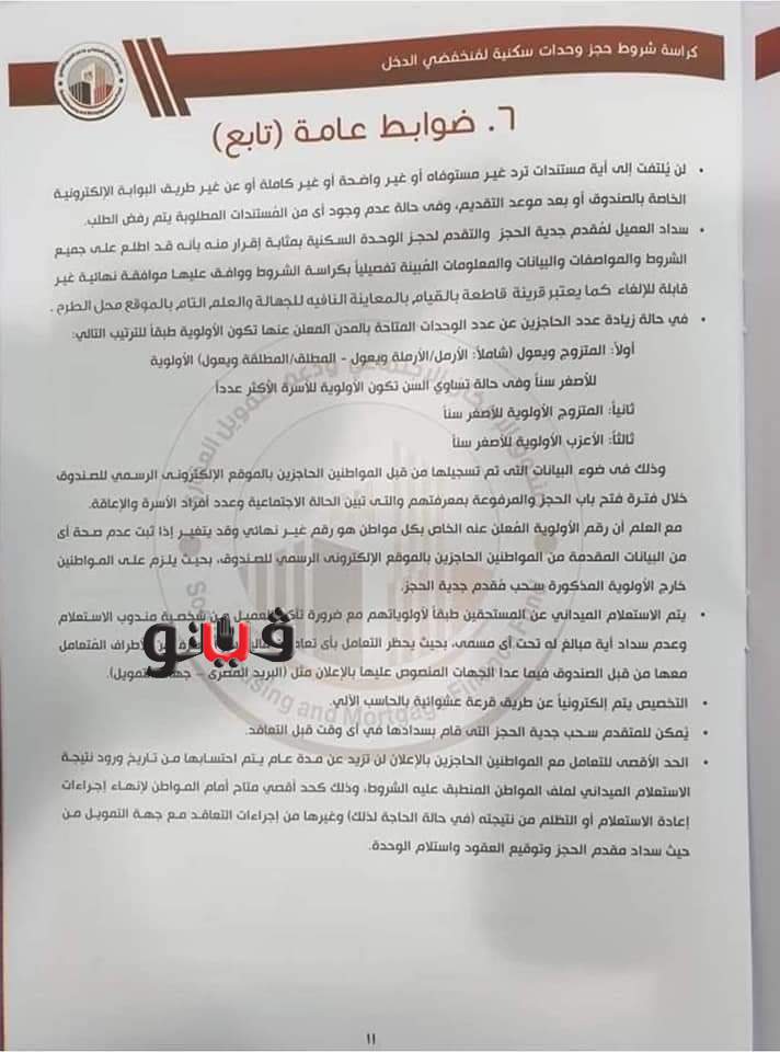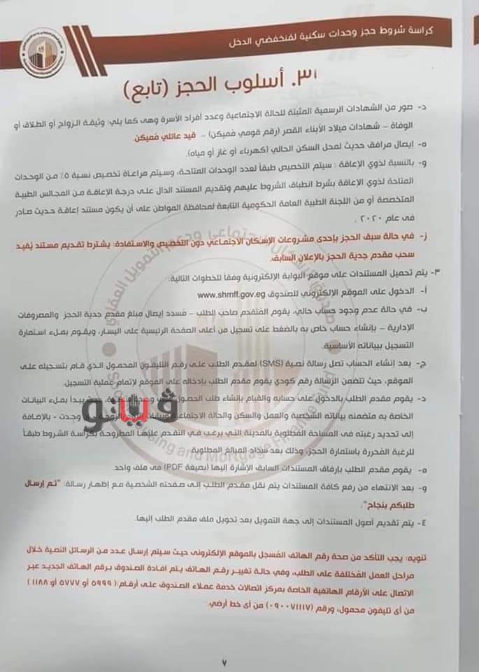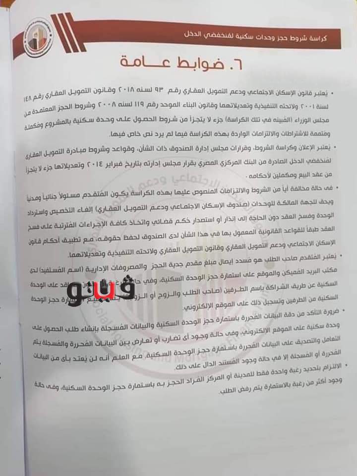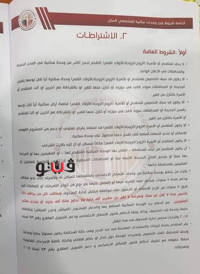 _ يشترط أن يكون المتقدم من أبناء المحافظة - الكائن بها الوحدة السكنية المُتقدم لها - أو المقيمين بها أو المرتبط بها عملاً أو بإحدى المدن الجديدة التابعة لها أو المحافظات المجاورة، على أن تكون الأولوية للعاملين أو المقيمين بالمحافظة ذاتها، ويلتزم من انتفع بوحدة سكنية من وحدات الإسكان الاجتماعي باستعمالها للسكن له ولأسرته على نحو منتظم ودائم لمدة 5 سنوات.