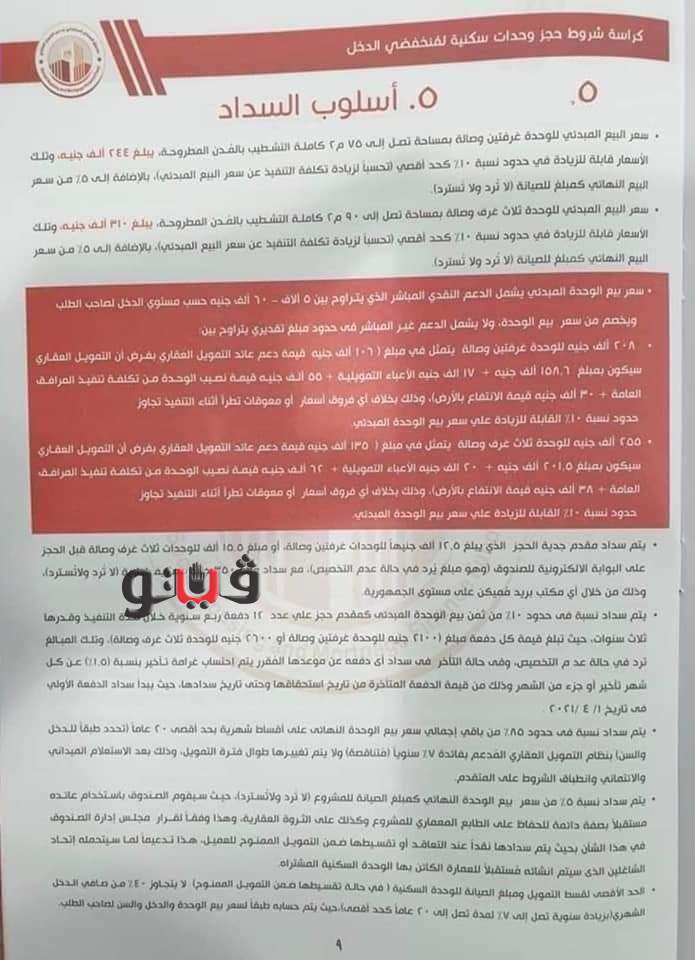 _ يُحظر شراء الوحدات نقداً ويتم السداد بنظام التمويل العقاري بسعر عائد 7 % سنوياً (متناقصة) لمدة تصل إلى 20 عاماً، ويكون الحد الأقصى لقسط التمويل لا يتجاوز 40 % من صافى الدخل الشهري (بزيادة سنوية تصل إلى 7 %)، حيث يتم حسابه طبقاً لسعر بيع الوحدة ودخل وسن صاحب الطلب.