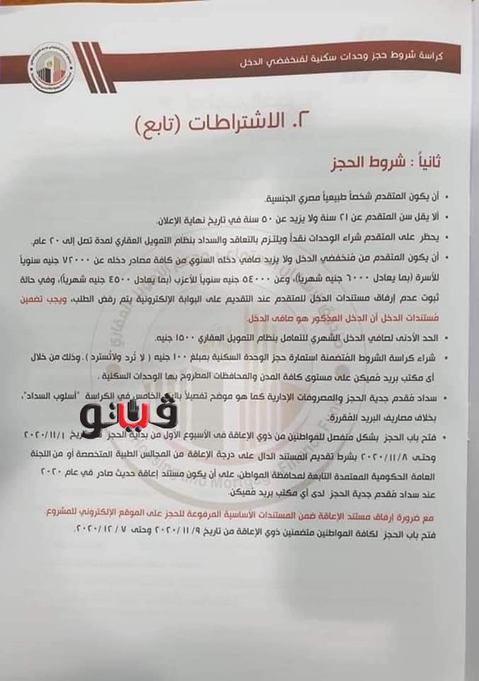 _ يكون الحد الأدنى لصافى الدخل الشهري للتعامل بنظام التمويل العقاري 1500 جنيه وأن يكون المتقدم من منخفضي الدخل، ولا يزيد صافى دخله السنوي من جميع مصادر دخله عن 72 ألف جنيه سنوياً للأسرة (بما يُعادل 6 آلاف جنيه شهرياً) وعن 54 ألف جنيه سنوياً للأعزب (بما يُعادل 4500 جنيه شهرياً).