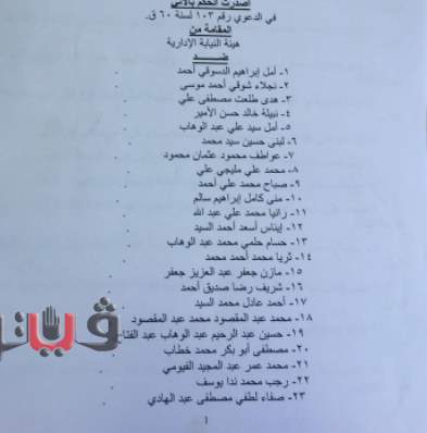 وقضت المحكمة بخصم أجر خمسة أيام من راتب كلًا من المحامون محمد علي مليجي، ومازن جعفر عبد العزيز وشريف رضا صديق ومحمد عبد المقصود محمد، ومجازاة كلًا من منى كامل إبراهيم، مدير إدارة الشكاوى ومصطفى أبو بكر محمد، مدير إدارة القضاء المدني ومحمد عمر عبد المجيد، مدير إدارة القضاء الإداري و فاطمة أبو طالب محمد، رئيس الإدارة المركزية للشئون القانونية بعقوبة الإنذار.