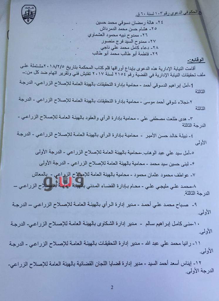 وتضمن الحكم براءة أمل إبراهيم الدسوقي ونجلاء شوقي أحمد وهدى طلعت مصطفى ونبيلة خالد حسن وأمل سيد علي ولبنى حسين سيد وعواطف محمود عثمان وحسام حلمي محمد وثريا محمد أحمد وأحمد عادل محمد وحسين عبد الرحيم عبد الوهاب صفاء لطفي مصطفى وهالة رمضان دسوقي وهشام حسن محمد وممدوح نبيه محمود وممدوح السيد فرج ودعاء كامل محمد، المحامين بالهيئة وصباح محمد علي، مدير إدارة الرأي بالهيئة ورانيا محمد علي، مدير إدارة التحقيقات وإيناس أسعد أحمد، مدير إدارة قضايا اللجان القضائية ورجب محمد ندا، مدير عام القضايا .