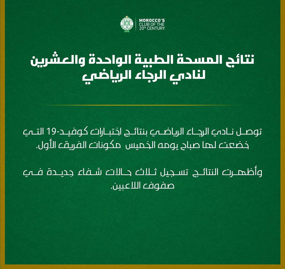 أعلن فريق الرجاء الرياضي المغربي لكرة القدم، عن شفاء ثلاثة لاعبين جدد اليوم الخميس، من فيروس كورونا المستجد.