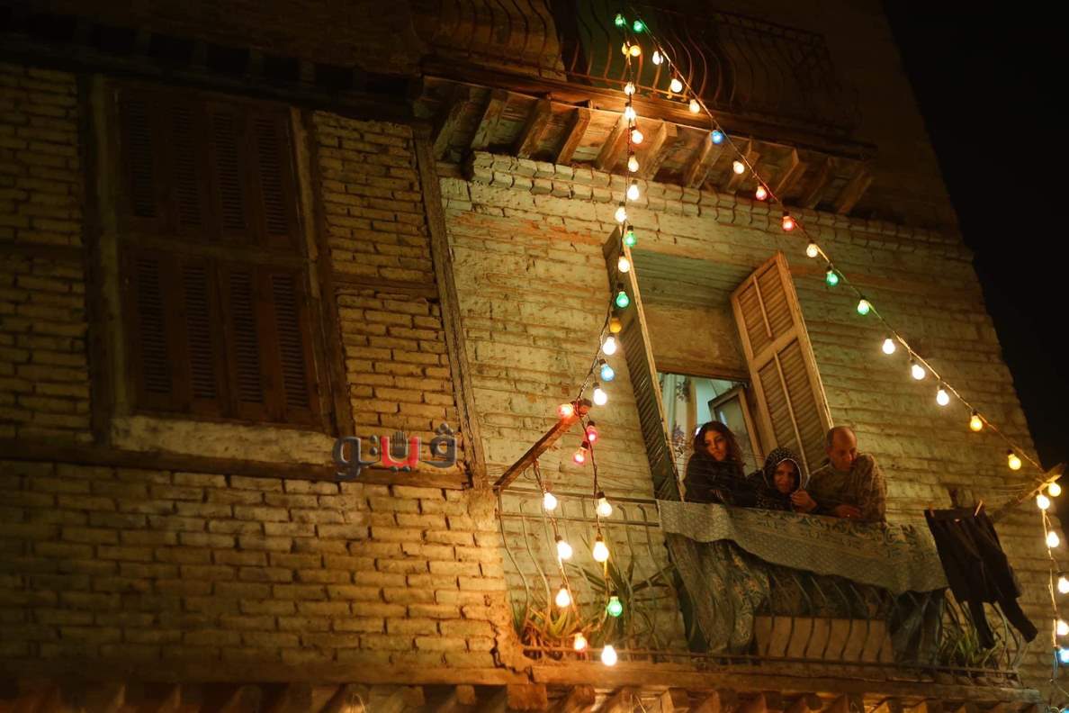 عائلة تنظر من بلكونة منزلهم المطل على احتفالات مولد الحسين.