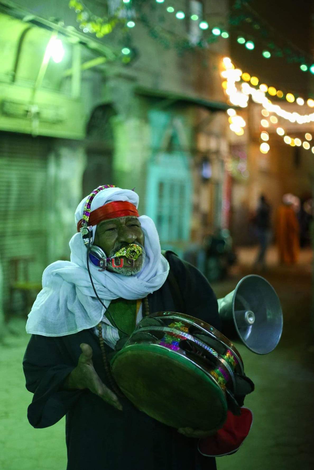 احد مريدى مولد السيدة سكينة يقوم بالقاء التواشيح الدينية من خلال المرور ولف الشوارع.