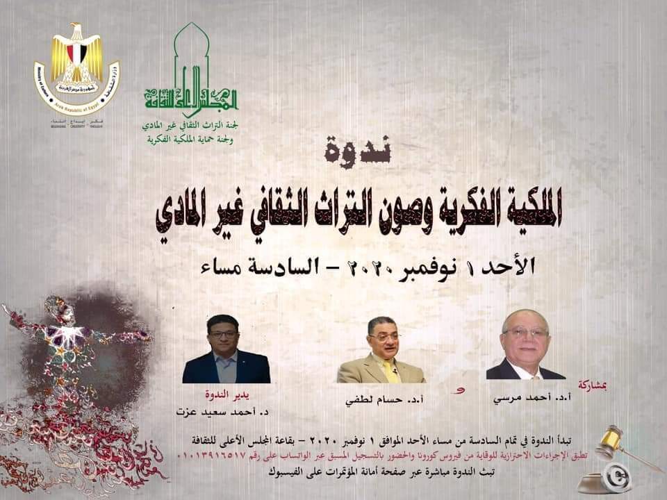 تنظم لجنتا التراث الثقافي غير المادي وحماية الملكية الفكرية بالمجلس الأعلى للثقافة، ندوة بعنوان "الملكية الفكرية وصون التراث الثقافي غير المادي"، في السادسة من مساء بعد غد الأحد الموافق 1 نوفمبر المقبل.
