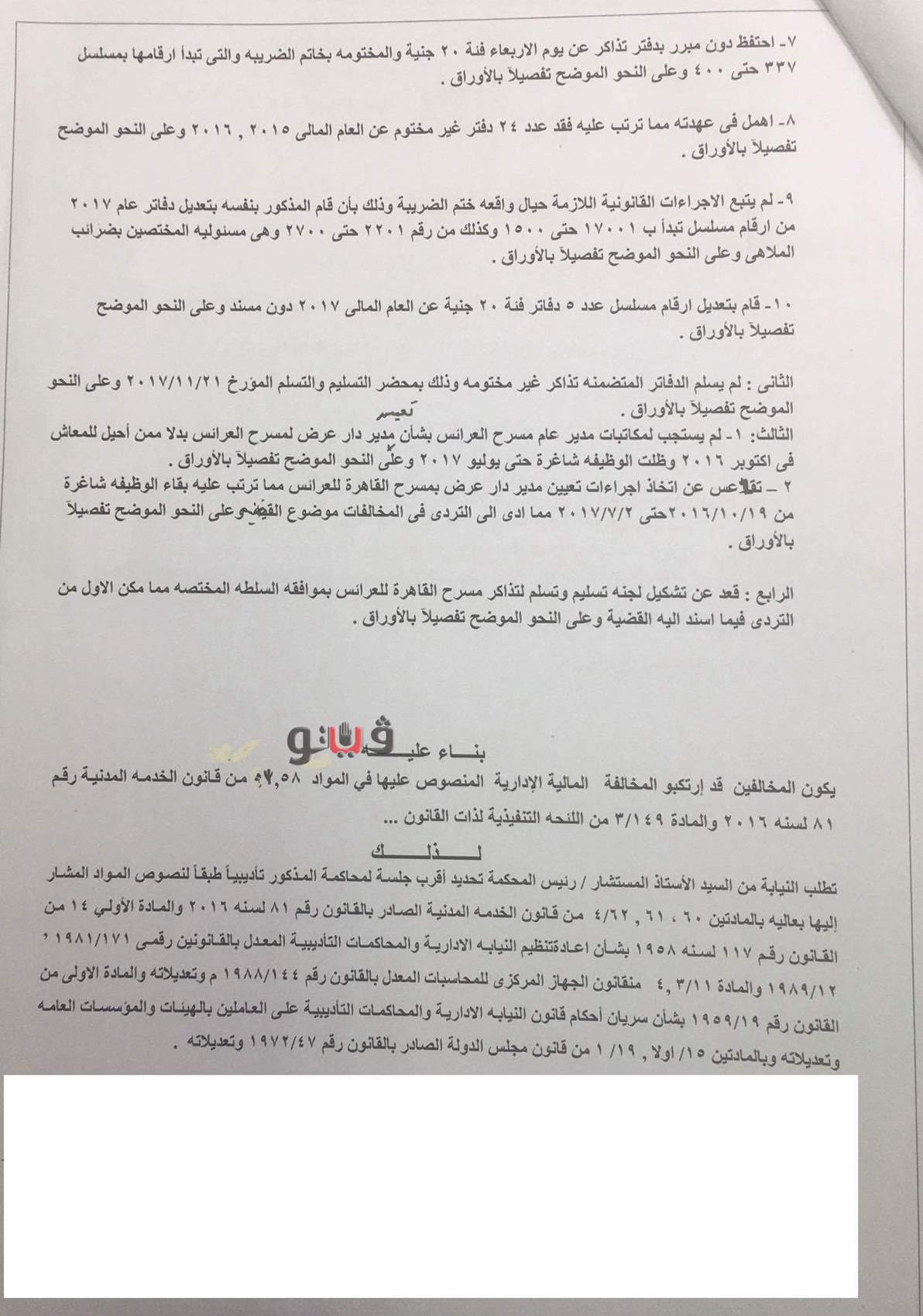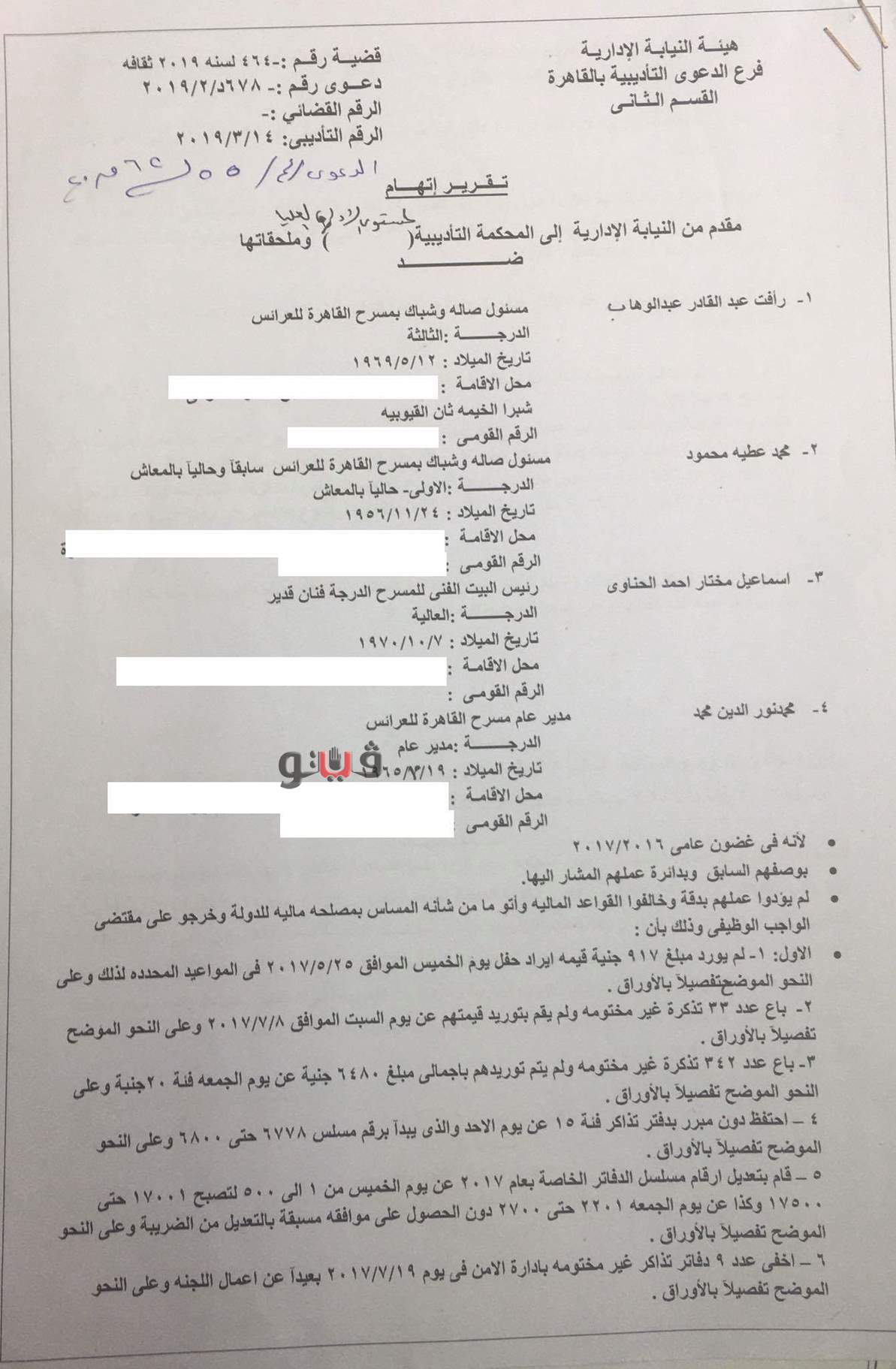 الفني للمسرح، و4 مسئولين من مساعديه للمحاكمة وإبلاغ النيابة العامة للتحقيق