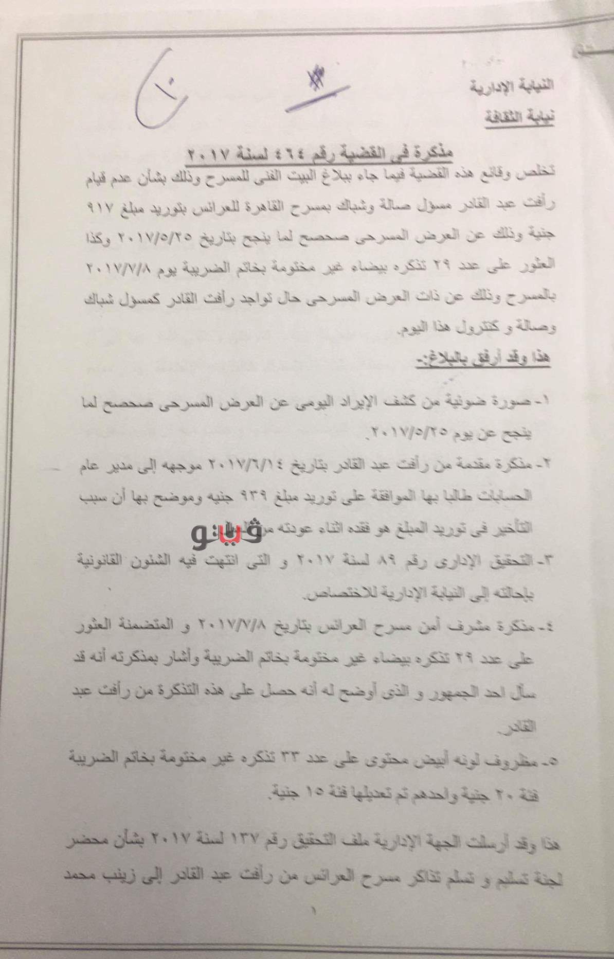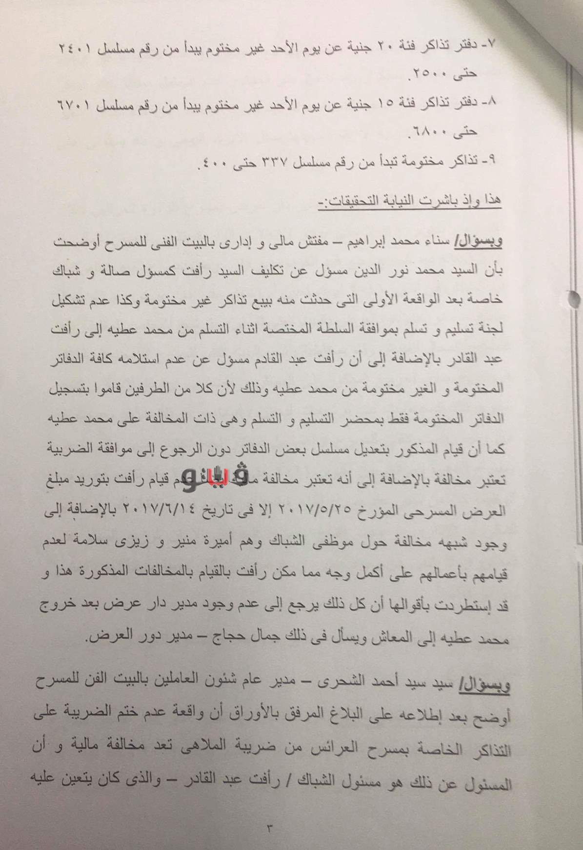 وأكدت التحقيقات أن رأفت عبد القادر عبد الوهاب، مسئول صالة وشباك بمسرح القاهرة للعرائس لم يورد قيمة إيراد حفل الخميس 25 يوليو 2017 في المواعيد المحددة، وباع 33 تذكرة غير مختومة ولم يقم بتوريد قيمتهم في 8 يوليو 2017، وأخفى عدد 9 دفاتر غير مختومة بإدارة الأمن في يوم 19 يوليو 2017 بعيدًا عن أعمال اللجنة، وقام بتعديل أرقام مسلسل عدد 5 دفاتر فئة 20 جنيهًا عن العام المالي 2017 دون سند.