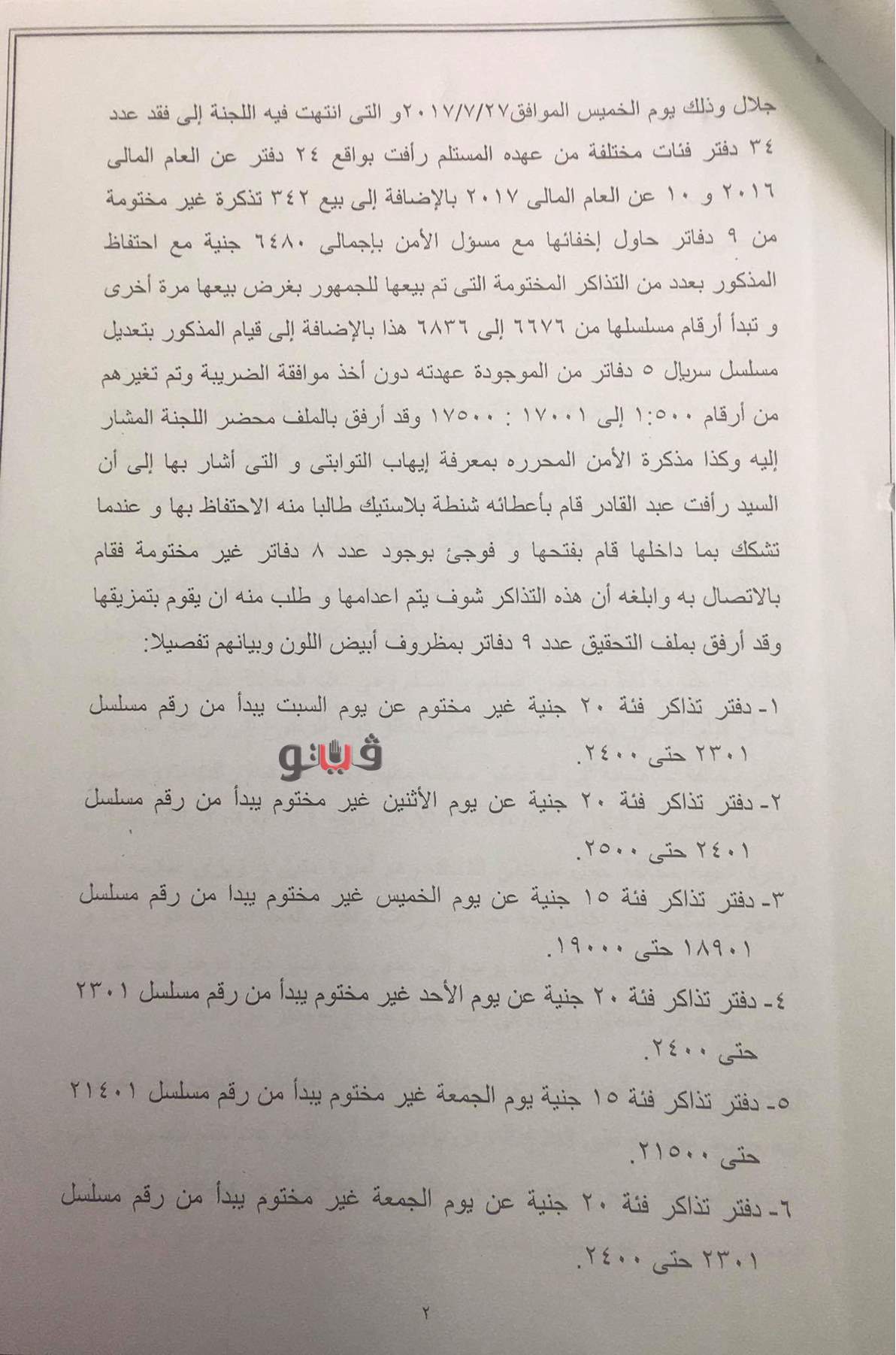 وكشفت التحقيقات أنه احتفظ دون مبرر بدفتر تذاكر فئة 20 جنيهًا والمختومة بخاتم الضريبة والتي تبدأ أرقامها بمسلسل 337 حتى 400، وأهمل في عهدته مما ترتب عليه فقد 24 دفتر غير مختوم عن العام المالي 2015 ــ 2016، ولم يتبع الإجراءات القانونية حيال واقعة ختم الضريبة، وذلك بأن قام بنفسه بتعديل دفاتر عام 2017 من أرقام مسلسل 17001 حتى 17500، و2201 حتى 2700، رغم كونها مسئولية المختصين بضرائب الملاهي.