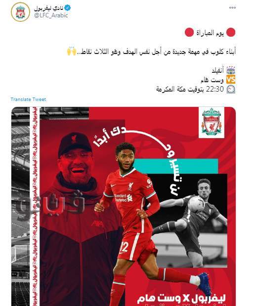 وكتب نادي ليفربول تغريدة على تويتر "يوم المباراة أبناء كلوب في مهمة جديدة من أجل نفس الهدف وهو الثلاث نقاط.. آنفيلد ضد وست هام"