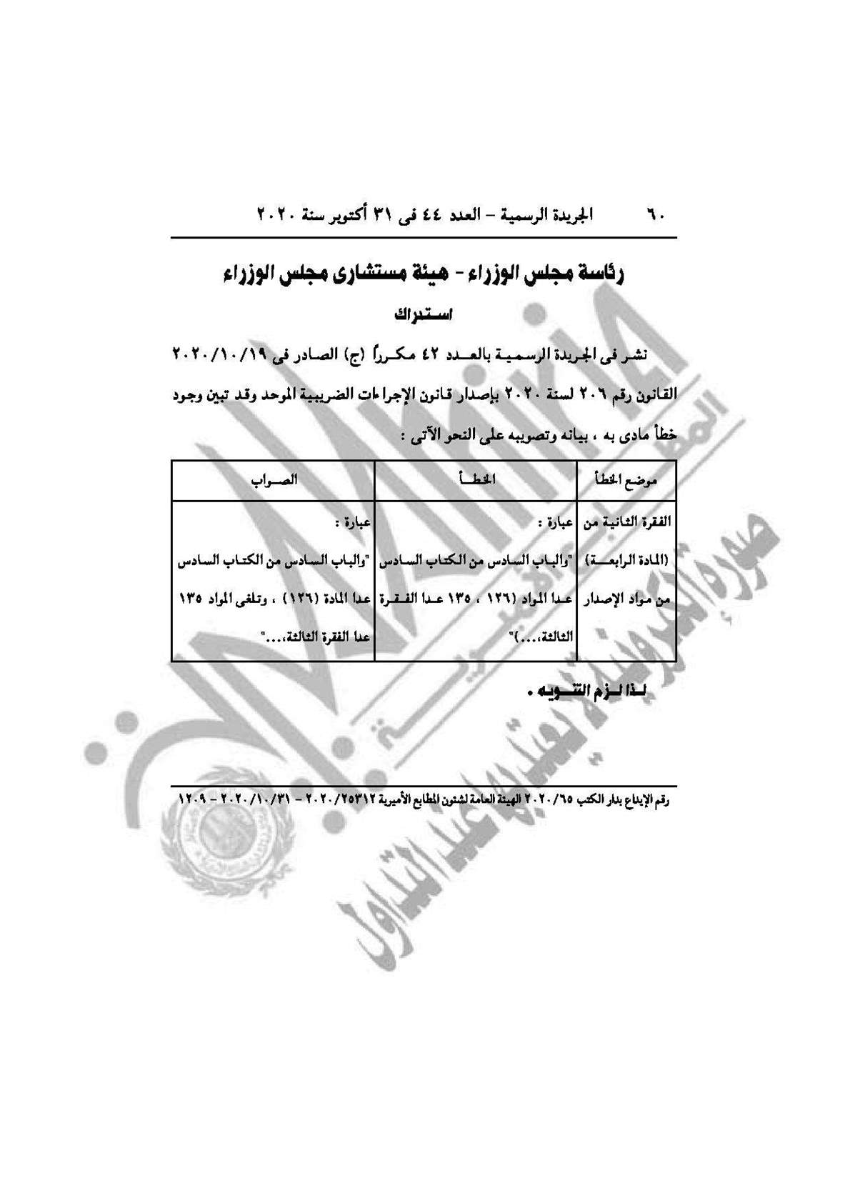 واستدراك رئاسة الوزراء للقانون رقم 206 لسنة 2020، بإصدار قانون الإجراءات الضريبية الموحد المنشور في الجريدة الرسمية بالعدد 42 مكرر (ج) الصادر بتاريخ 19/10/2020