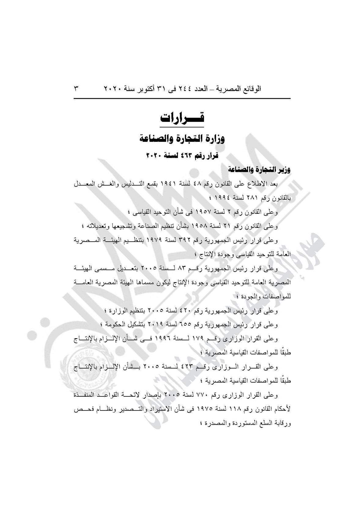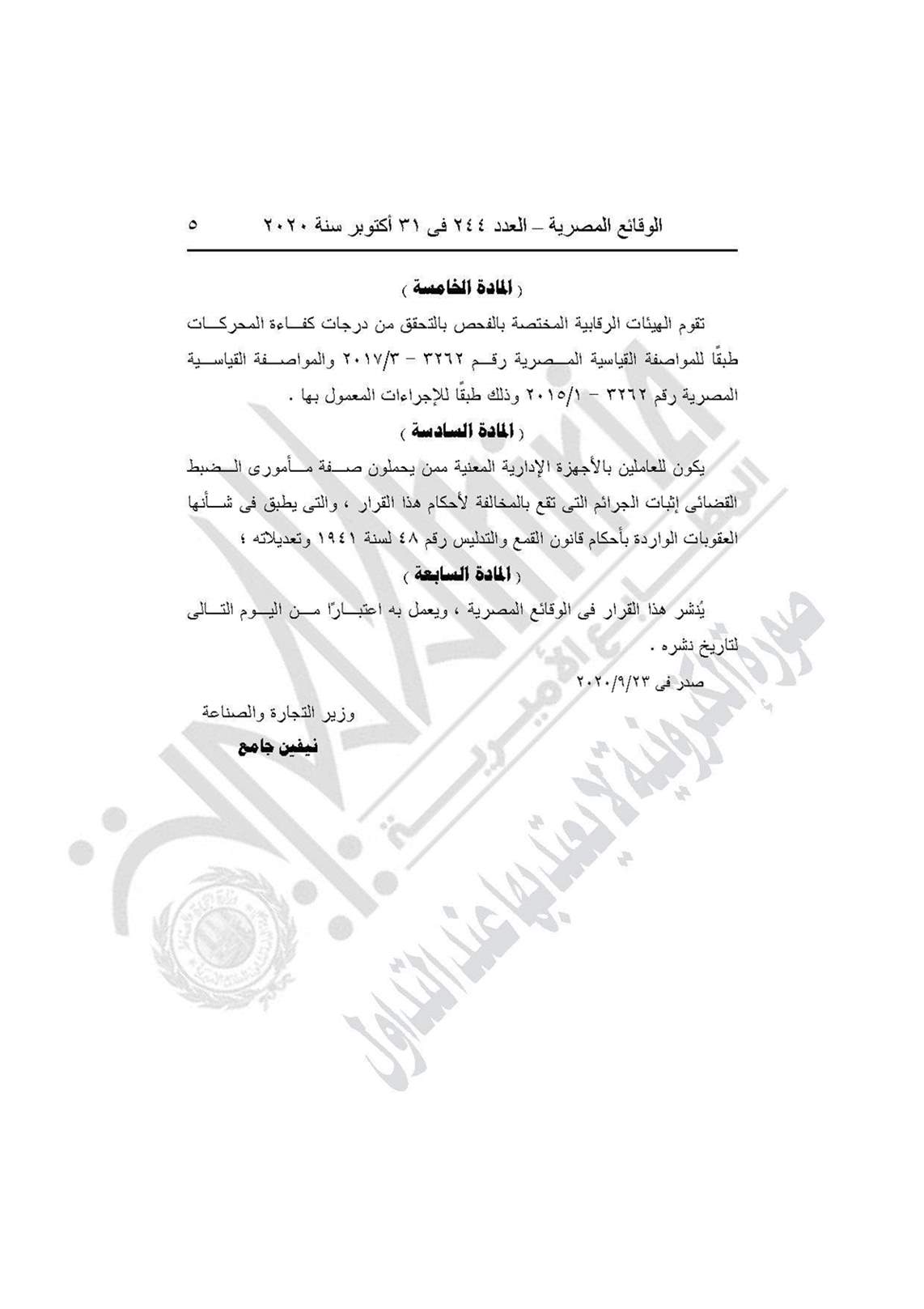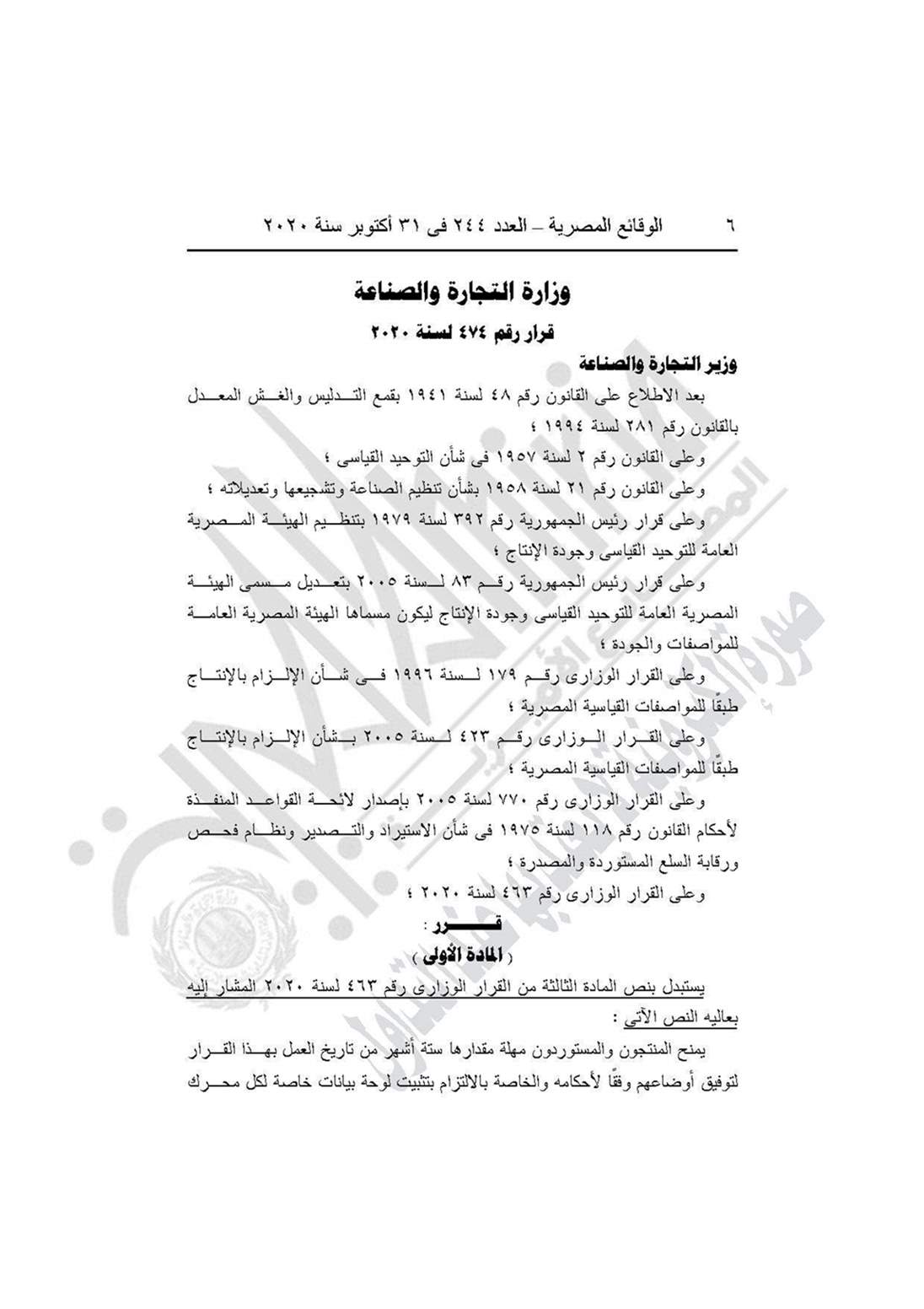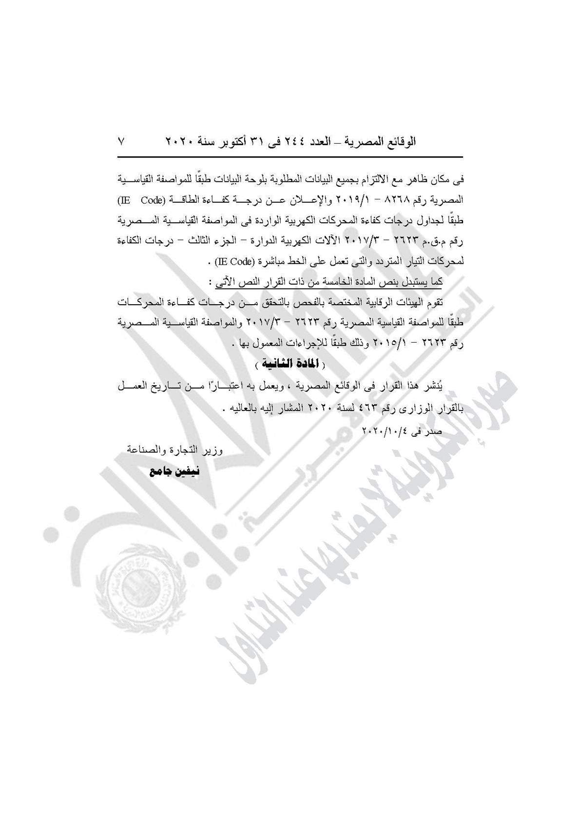 نشرت جريدة الوقائع المصرية في عددها رقم 244، الصادر في 31 أكتوبر 2020، قرارا وزارة التجارة والصناعة، بشأن التزام المنتجون والمستوردون للمحركات الكهربية بأن تكون مطابقة للمواصفة القياسية المصرية لمستويات الطاقة المصرية، ويمنح المنتجون والمستوردون مهلة مقدارها 6 أشهر من تاريخ العمل بهذا القرار لتوفيق أوضاعهم.