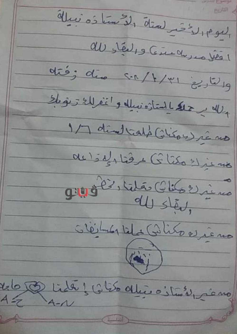 ودون طالب آخر بخط يده رسالة جاء بها " اليوم الأخير للأستاذة نبيلة ، أفضل مدرسة عندي ، البقاء لله، قائلا الله يرحمك استاذتي ويغفر ذنوبك من غيرك مكناش نجحنا ولا اتعلمنا الخط البقاء لله علمتينا المشاركة في المسابقات وبدونك لم نكن نتعلم شيئا.