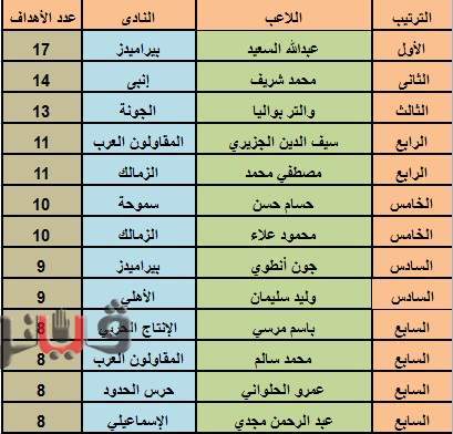 وجاء ترتيب باقي الهدافين كما هو موضح بالجدول المرفق.