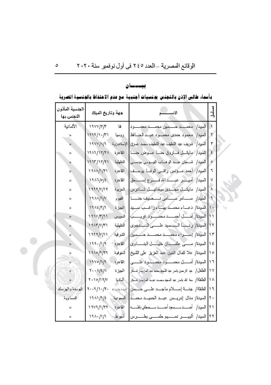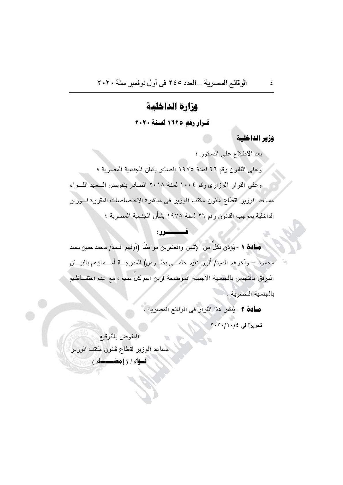 نشرت جريدة الوقائع المصرية في عددها رقم 245، الصادر في أول نوفمبر 2020، قرار وزارة الداخلية رقم 1625 لسنة 2020، بسحب الجنسية المصرية من 22 مواطنًا والأذن بتجنيسهم بالجنسية الأجنبية.