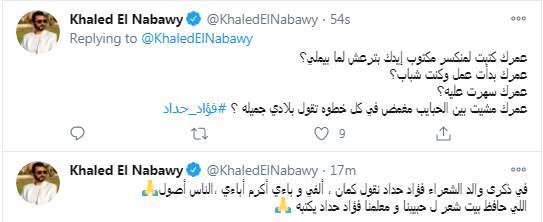 وكتب خالد النبوي تغريدة على تويتر "في ذكرى والد الشعراء فؤاد حداد نقول كمان ، ألفي و باءي أكرم أباءي، الناس أصول.. اللي حافظ بيت شعر ل حبيبنا ومعلمنا فؤاد حداد يكتبه".