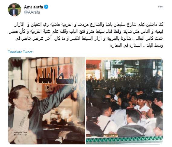 وكتب عمرو عرفة تغريدة على تويتر قال فيها: " كنا داخلين علي شارع سليمان باشا والشارع مزدحم و العربيه ماشيه زي الثعبان و الإزاز فيميه والناس مش شايفة وقفنا قدام سينما مترو فتح الباب وقف على عتبة العربية وكأن مصر خدت كاس العالم.. شالونا بالعربية وازاز السينما اتكسر وده كان آخر عرض خاص في وسط البلد.. السفارة في العمارة".