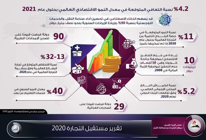 كما توقع التقرير أن تصل نسبة النمو في حصة البلدان النامية من التجارة العالمية إلى 11% بحلول عام 2030 إذا ما تم تمكينها رقميًّا، مشيرًا إلى أن ما يقرب من 90 دولة فرضت قيودًا على تصدير الإمدادات الطبية، و29 دولة فرضت قيودًا على الصادرات.