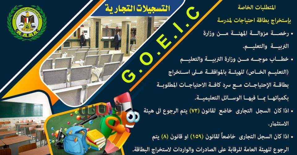 حددت الهيئة العامة للرقابة على الصادرات والواردات متطلبات الخاصة لاستخراج بطاقة احتياجات مدرسة.