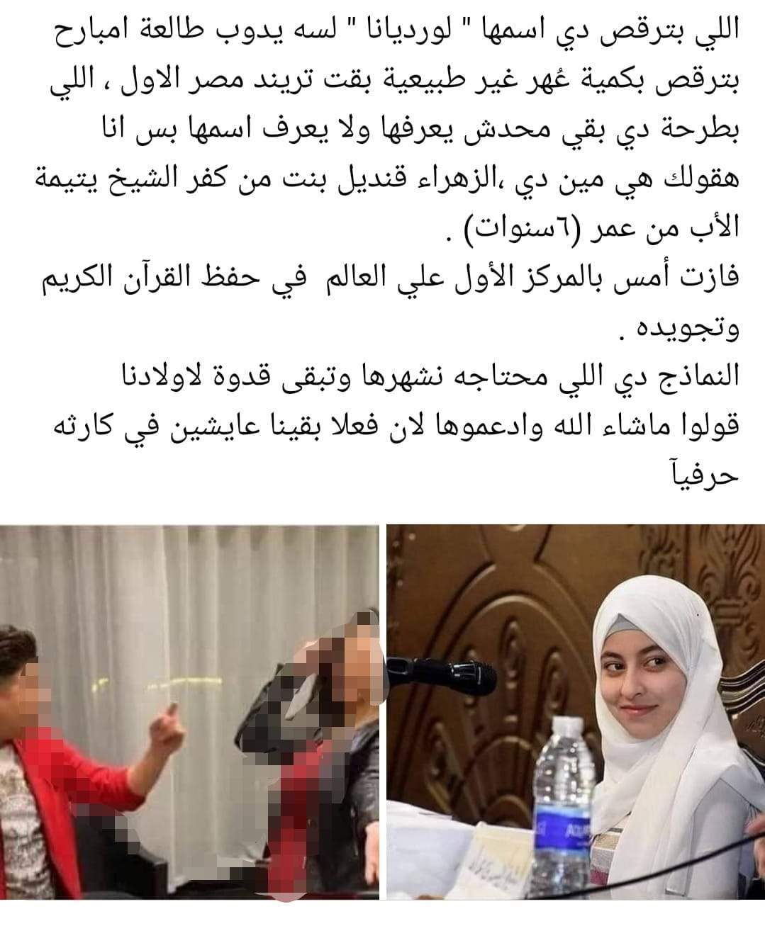 رفضت الطالبة الزهراء لايق حلمي قنديل إحدى طالبات الأزهر الشريف، الحاصلة على المركز الأول في مسابقة القرآن الكريم على مستوى الجمهورية التابعة لوزارة الشباب والرياضة، البوست المتداول عبر صفحات مواقع التواصل الاجتماعي والذي يقارن بينها وبين الراقصة البرازيلية "لورديانا".