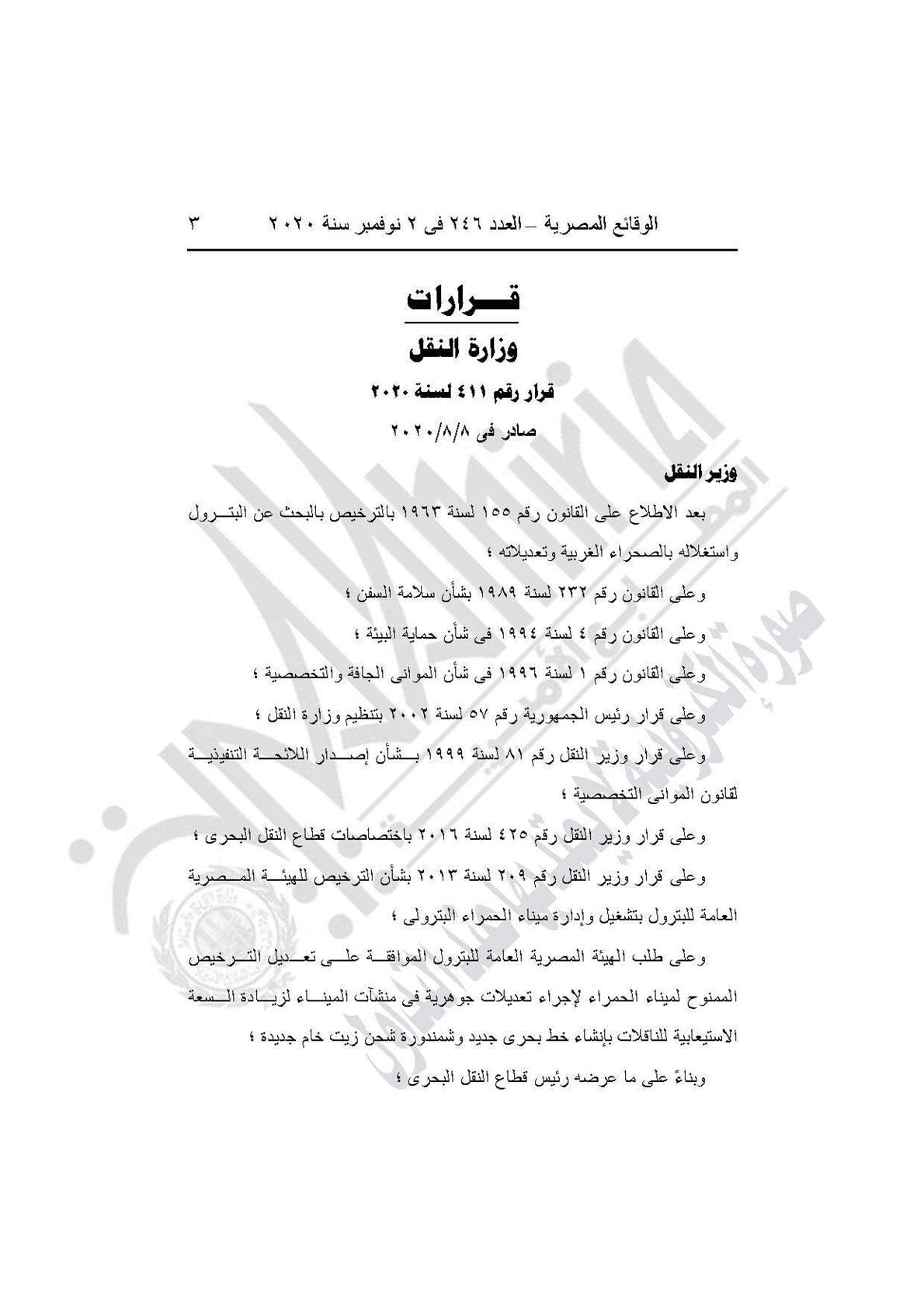 القرار رقم 411 لسنة 2020، بشأن يرخص للهيئة المصرية العامة للبترول بتشغيل وإدارة ميناء الحمراء البترولى الواقع على الساحل الشمالى الغربى - على بعد 120 كيلو متر - منطقة العلمين - غرب مدينة الإسكندرية بغرض استقبال وشحن وتفريغ ناقلات البترول والخدمات البحرية المتعلقة بذلك.