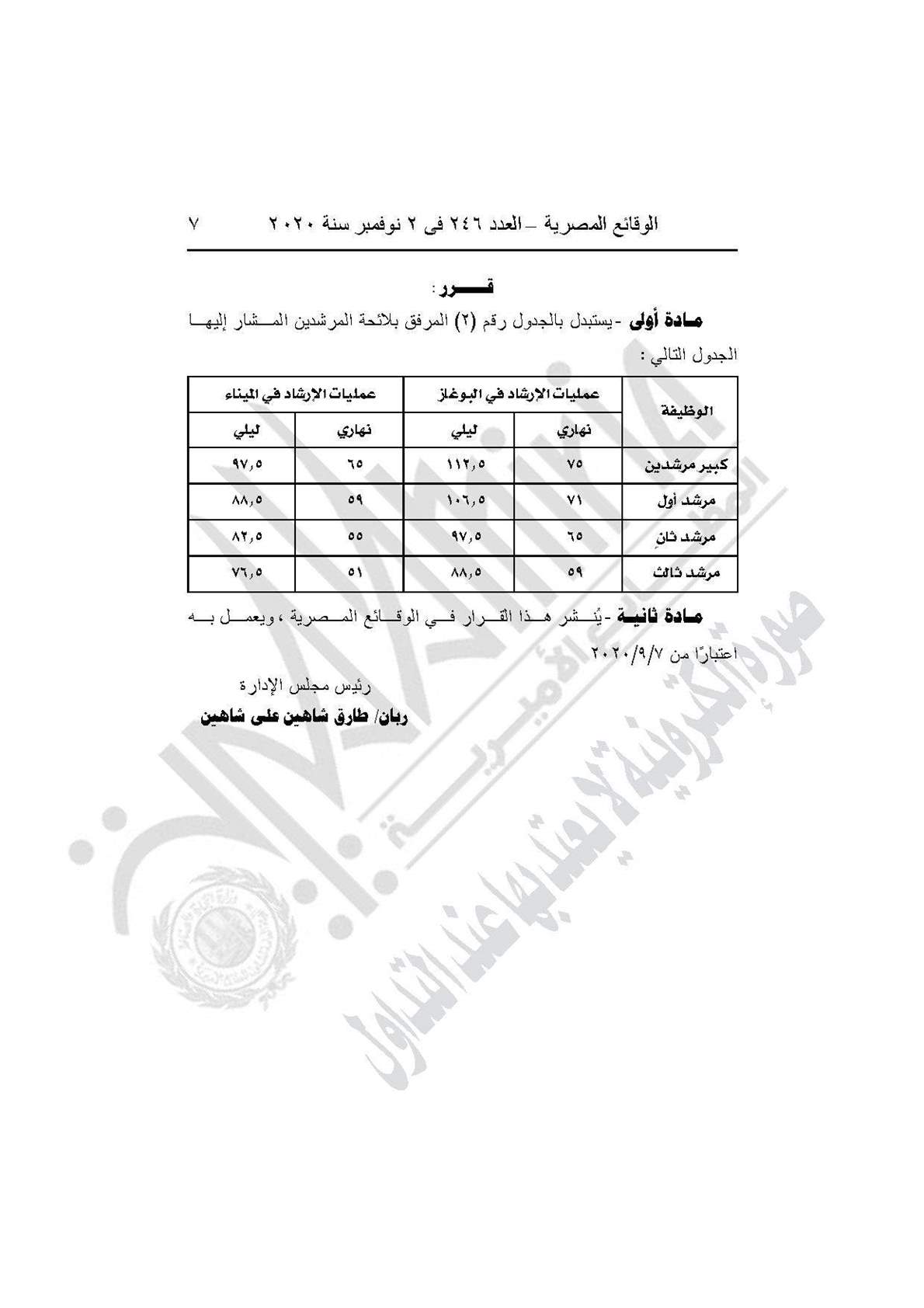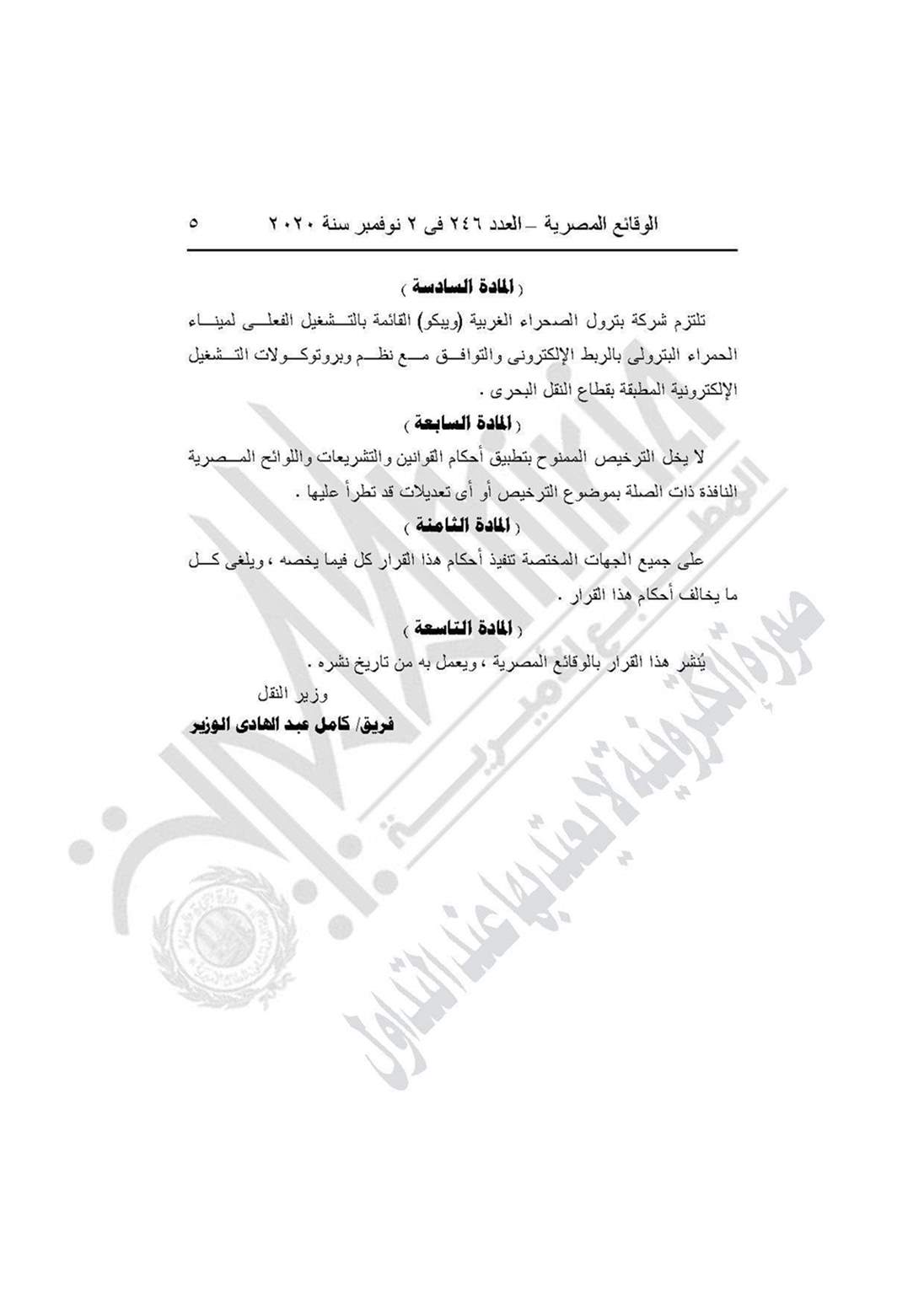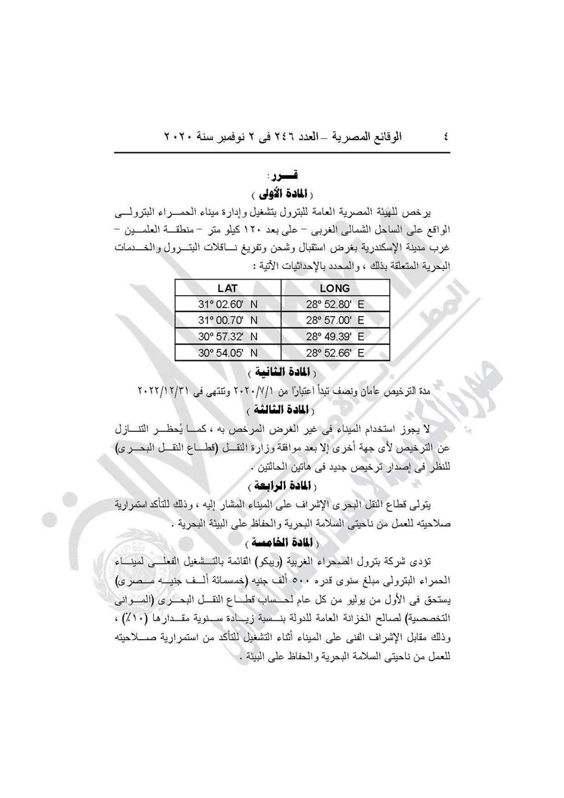 نشرت جريدة الوقائع المصرية في عددها رقم 246، الصادر في 2 نوفمبر 2020، 3 قرارات لوزارة النقل بشأن الترخيص للهيئة المصرية العامة للبترول بتشغيل وإدارة ميناء الحمراء البترولى، والاستبدال بالجدول رقم (2) بلائحة المرشدين، وتحديد فئات مقابل خدمة انتظار السيارات بميناءى الإسكندرية والدخيلة.