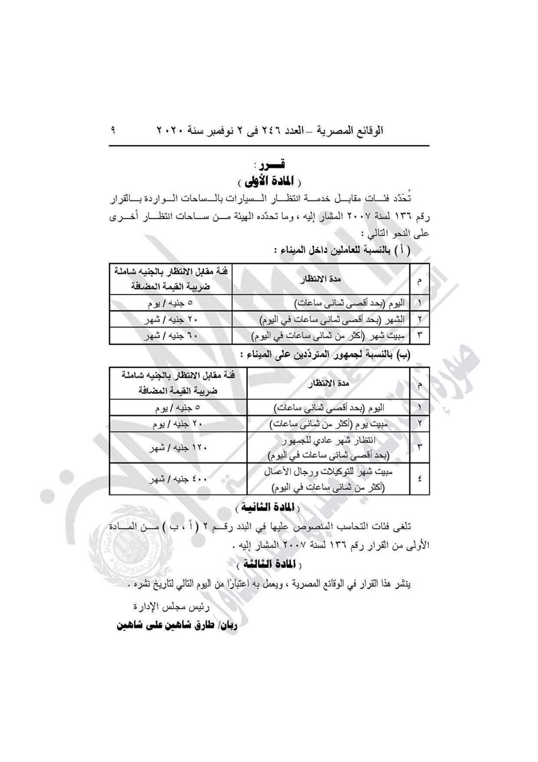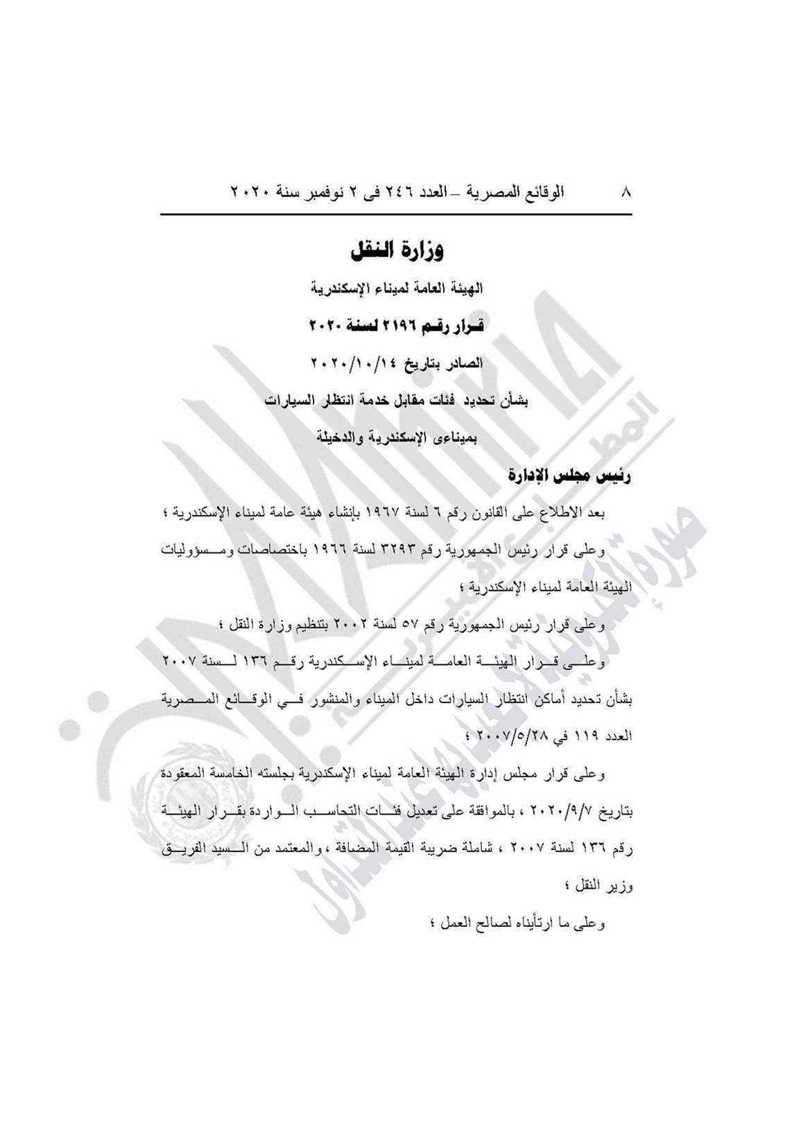 والقرار رقم 2196 لسنة 2020، بشأن تحديد فئات مقابل خدمة انتظار السيارات بميناءى الإسكندرية والدخيلة.