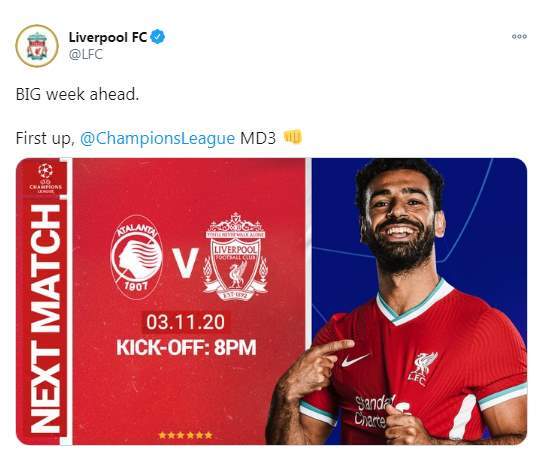 وكتب نادي ليفربول تغريدة على تويتر قال فيها: "أمامنا أسبوع كبير. أولا، دوري أبطال أوروبا".