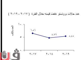 أكد الجهاز المركزى للتعبئة العامة والإحصاء، أن عدد حالات البروتستو التي دفعت قيمته 5446 حالة عام 2019 مقابل 4791 حالة عام 2018 بارتفاع قدره 655 حالة بنسبة 13.7٪.
