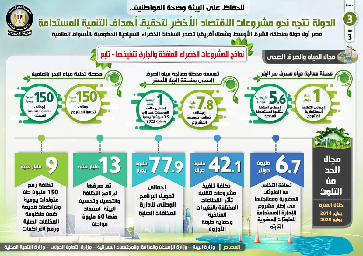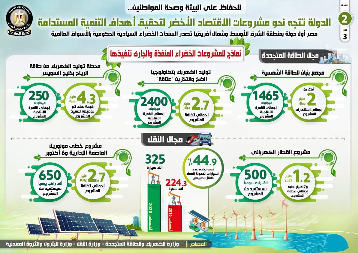 وفي هذا الصدد، نشر المركز الإعلامي لمجلس الوزراء، تقريراً شمل إنفوجرافات تسلط الضوء على اتجاه الدولة نحو مشروعات الاقتصاد الأخضر، وذلك للحفاظ على البيئة وصحة المواطنين.