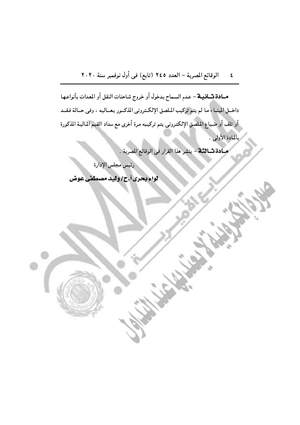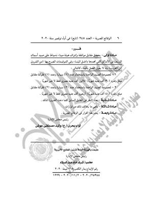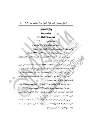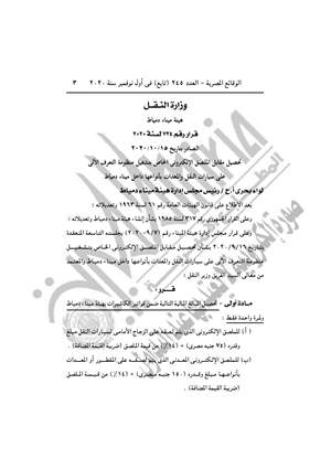 نشرت جريدة الوقائع المصرية في عددها رقم 245 (تابع)، الصادر في أول نوفمبر 2020، قرارا وزارة النقل هيئة ميناء دمياط بتحصيل مقابل الملصق الإلكترونى للتعرف الآلي على سيارات النقل والمعدات، وتسعير صيد أسماك الزريعة بميناء دمياط.