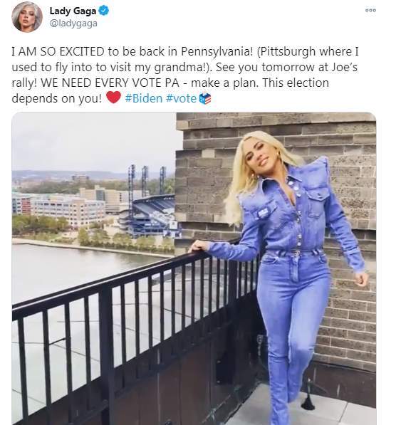 وكتبت ليدي جاجا عبر تويتر "أنا متحمسة جدًا للعودة لبنسلفانيا! بترسبرج حيث اعتدت السفر لها لزيارة جدتي، أراكم غدًا في تجمع بايدن، نحتاج لكل صوت- خطط- الانتخابات تعتمد عليك"