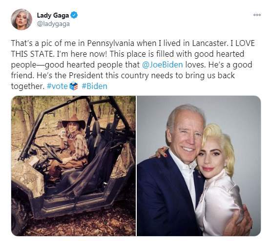 وواصلت الليدي جاجا دعمها بتغريدة أخري وصورة لها مع بايدن قالت فيها: "هذه الصورة ليّ في بنسلفانيا حيث أعيش في لانستر. أحب هذه الولاية وأنا هنا الآن. وهذا المكان مليء بالقلوب ذات القلوب الطبية. الناس ذوي القلوب الطيبة الذين يحبهم بايدن. انه صديق جيد. أنه الرئيس لهذا البلد الذي يحتاج أن يعيد جمعنا سويا"