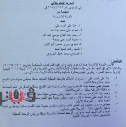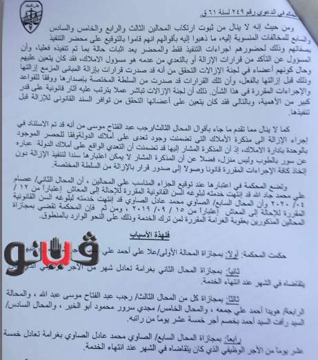 قضت المحكمة بخصم أجر شهر من راتب علا علي أحمد، مسئولة الأملاك بالوحدة المحلية لمجلس مدينة منيا القمح لقيامها بإدراج اسم المواطن عبد الحميد ابراهيم عبد الحميد، ضمن حملة الإزالات المشكلة مما ترتب عليه ازالة منزله بنطاق الوحدة المحلية الجديدة دون سند قانوني، وقامت بالإرشاد شفاهة بوجود تعدي على أملاك الدولة بالمخالفة للحقيقة.