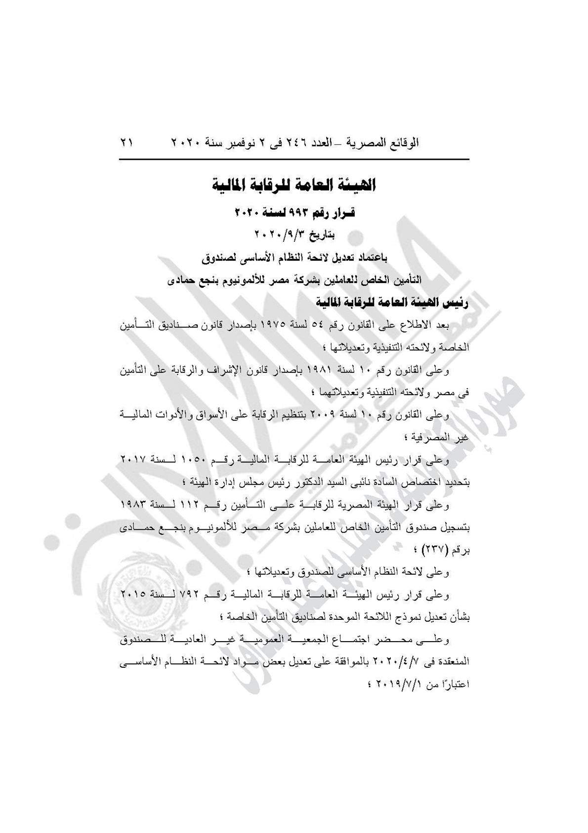 القرار رقم 993 لسنة 2020، باعتماد تعديل لائحة النظام الأساسى لصندوق التأمين الخاص للعاملين بشركة مصر للألمونيوم بنجع حمادى.