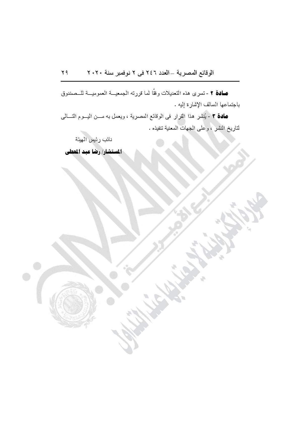 نشرت جريدة الوقائع المصرية في عددها رقم 246، الصادر في 2 نوفمبر 2020، قرارا الهيئة العامة للرقابة المالية باعتماد تعديل لائحة النظام الأساسى لصندوق التأمين الخاص للعاملين بشركة مصر للألمونيوم، والهيئة العامة للتحكيم واختبارات القطن.