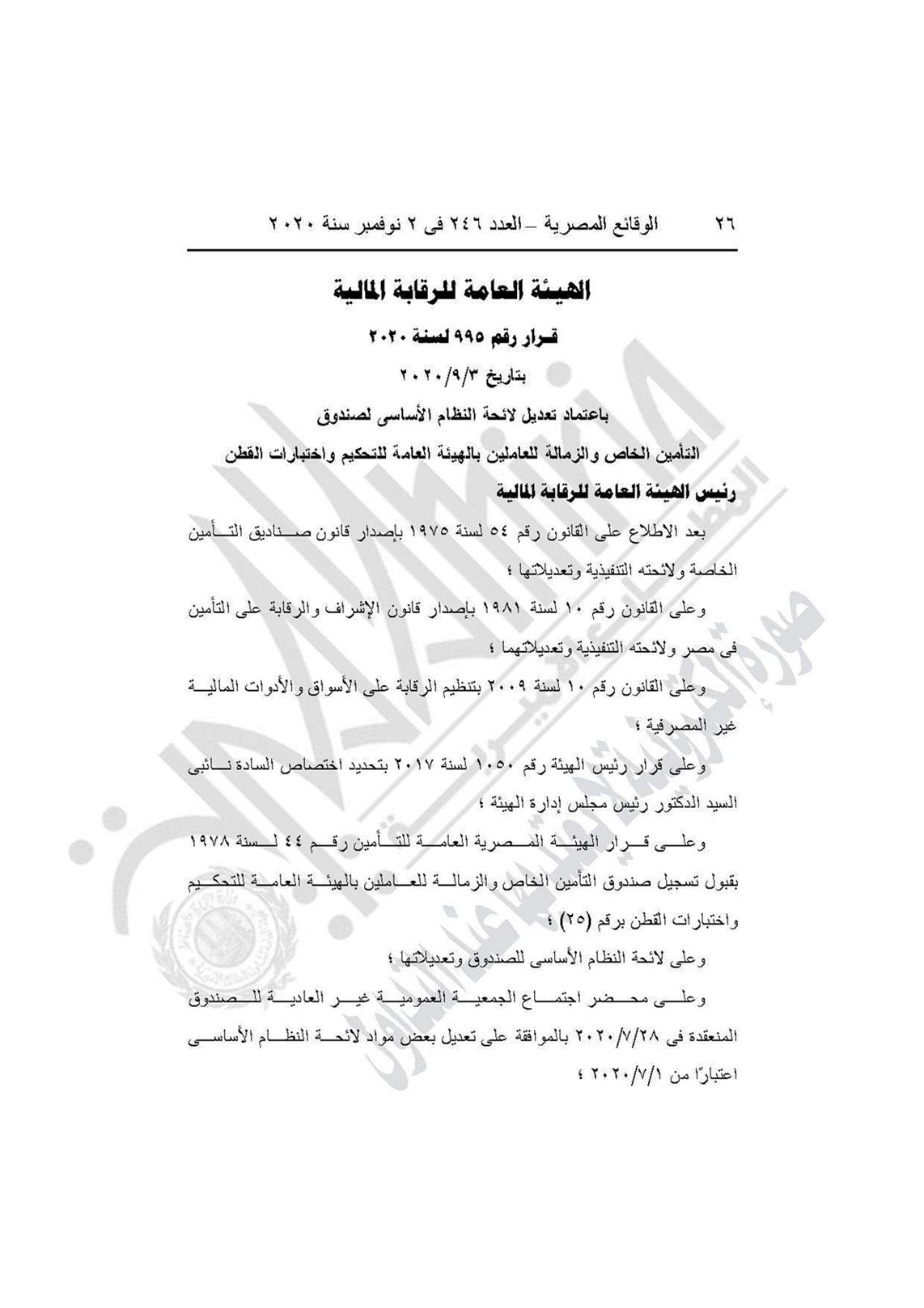والقرار رقم 995 لسنة 2020، باعتماد تعديل لائحة النظام الأساسى لصندوق التأمين الخاص والزمالة للعاملين بالهيئة العامة للتحكيم واختبارات القطن.