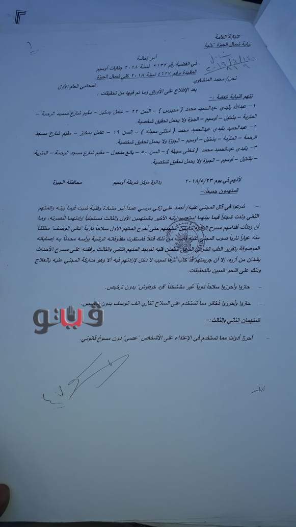 وكانت نيابة أوسيم قد أحالت المتهمين من الأول إلى الثالث بتهمة الشروع في قتل جاره بدائرة أوسيم وحيازة وإحراز أسلحة نارية وبيضاء.