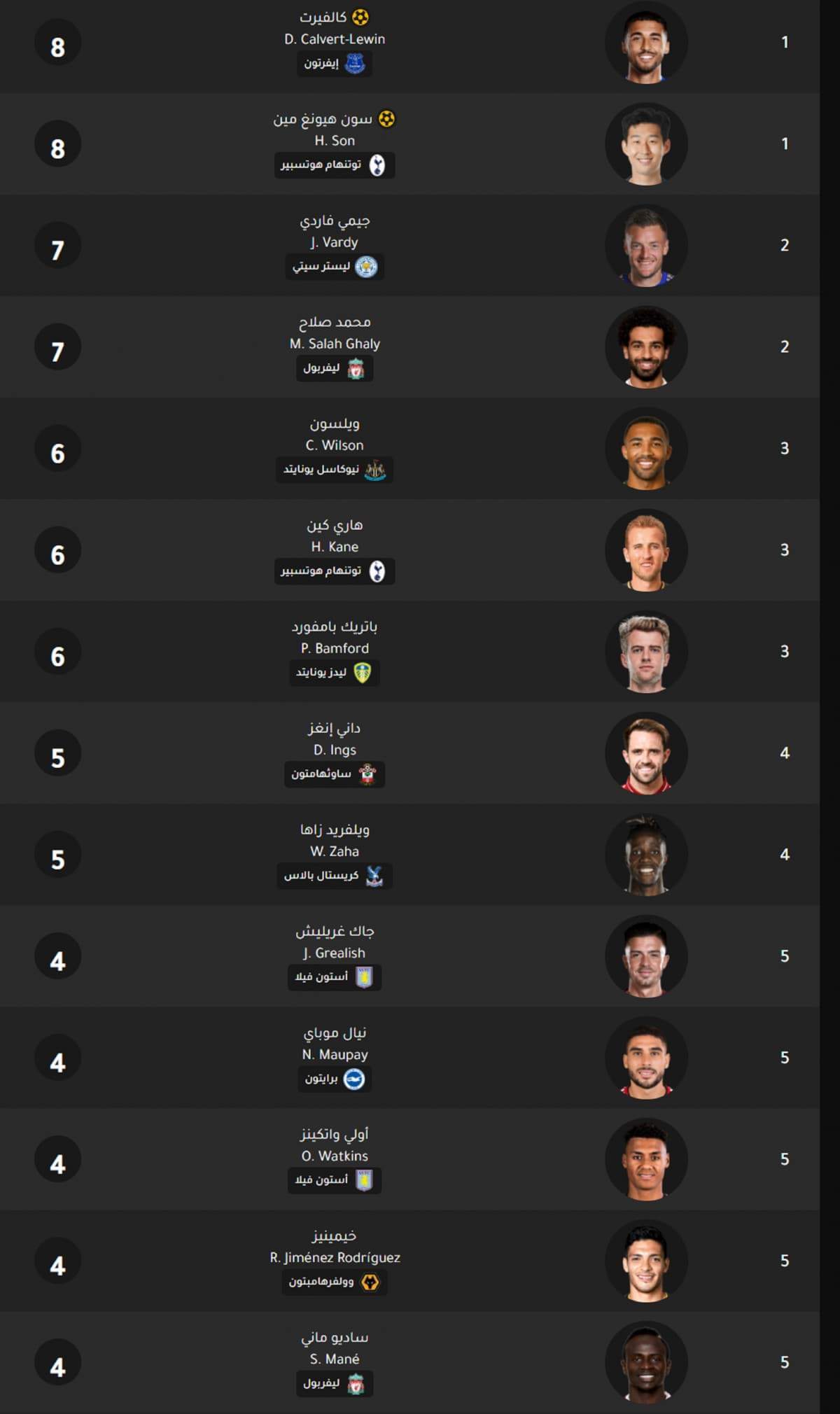 1. هيونج مين سون (توتنهام)، ودومينيك كالفيرت ليوين (إيفرتون)، ولكل منهما 8 أهداف.