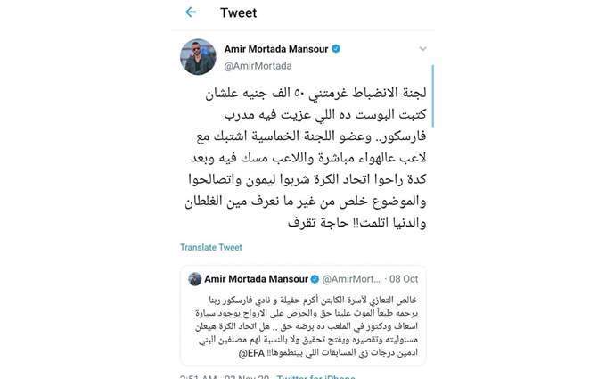 وكتب أمير مرتضى منصور عبر حسابه قائلا: لجنة الانضباط غرمتنى 50 ألف جنيه علشان كتبت البوست ده اللى عزيت فيه مدرب فارسكور.. وعضو اللجنة الخماسية اشتبك مع لاعب عالهواء مباشرة واللاعب مسك فيه وبعد كدة راحوا اتحاد الكرة شربوا ليمون واتصالحوا والموضوع خلص من غير ما نعرف مين الغلطان والدنيا اتلمت. حاجة تقرف".