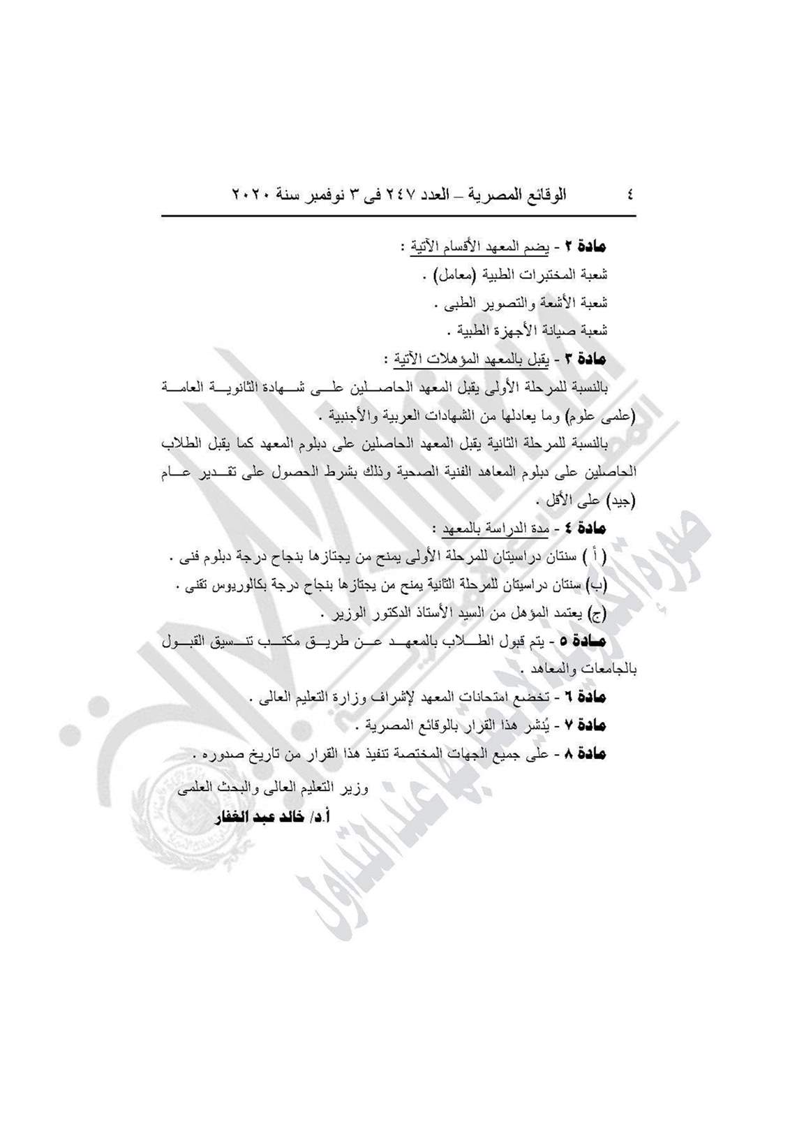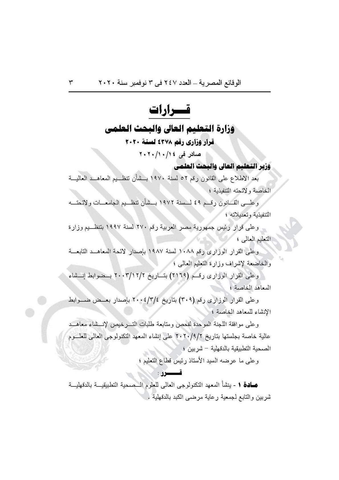 وينص القرار على إنشاء المعهد التكنولوجى العالى للعلوم الصحية التطبيقية بالدقهلية شربين والتابع لجمعية رعاية مرضى الكبد بالدقهلية .