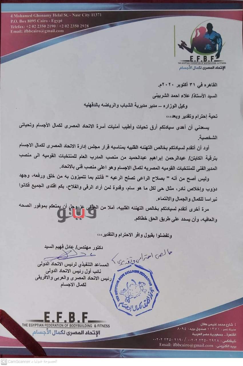 كما وجه خطابا لوكيل وزارة الشباب والرياضة بالدقهلية هنأه خلال بالترقيه التى حصل عليها الكابتن عبد الرحمن إبراهيم كما جاء فى خطابه " وليس اصح من أنه بصلاح الراعى تصلح الرعية فأنتم بما تتميزون به من خلق ورفعه وجهد دؤوب واخلاص نادر مثال حى لكل ما هو سام وقدوة لمن أراد الرقى والصلاح وبكم اقتدى الجميع فكانوا نبراسا للكمال والجمال والانتماء " .